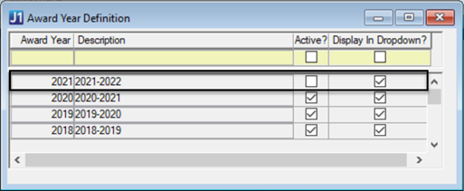 The 2021-2022 financial aid award year is available in the Award Year Definition window. Select the Active? checkbox when you are ready to work with it. You can also deselect Display in Dropdown? to remove it for now until the application system opens.