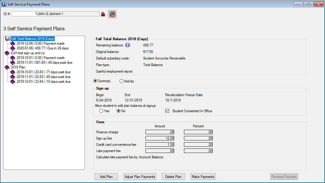 Once eligible plans are made available to students in the Payment Plan Assignment process, students will have the option of signing up for those plans in the JICS Campus Portal. If you need to add a plan to a student manually, you can use the Self-Service Payment Plans window.